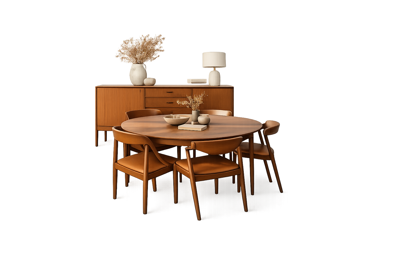 Stolene fremstår nyrenoverede med gennemgået og opfrisket teakstel samt nypolstret sæde og ryg i eksklusivt cognacfarvet læder. Polstringen er udført med koldskum for optimal komfort og holdbarhed, og det varme læder spiller smukt sammen med teaktræets glød.